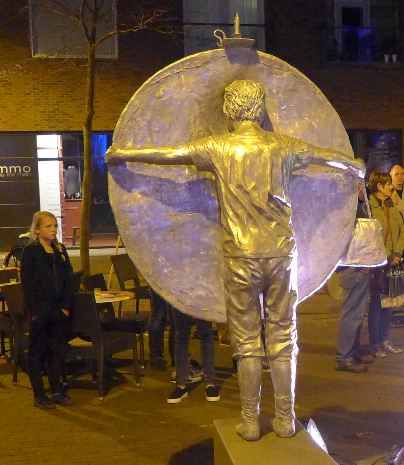 It doesn’t end there. Last weekend I made a trip I have been meaning to make for 2 years, to Gelderland, a province in the east of the Netherlands, for the World Living Statues festival. Simply incredible. I was dithering whether to go or not and am so glad I went. First, statues by night in the small town of Ede. I wrote to the organisers during the week and managed to meet up with three ‘real-life’ living statues: Afke, Minco and Elejan, all on their night off, before the big next day event, so carousing as tourists to check out the other living statues. It was fantastic to be able to interview them and ask them all about their craft. I soon realised that living statues is a community of friends and colleagues who are as passionate and serious about what they do as we are with poetry. There are prizes to be won, festivals to attend, and criticism to be dealt about other statues.