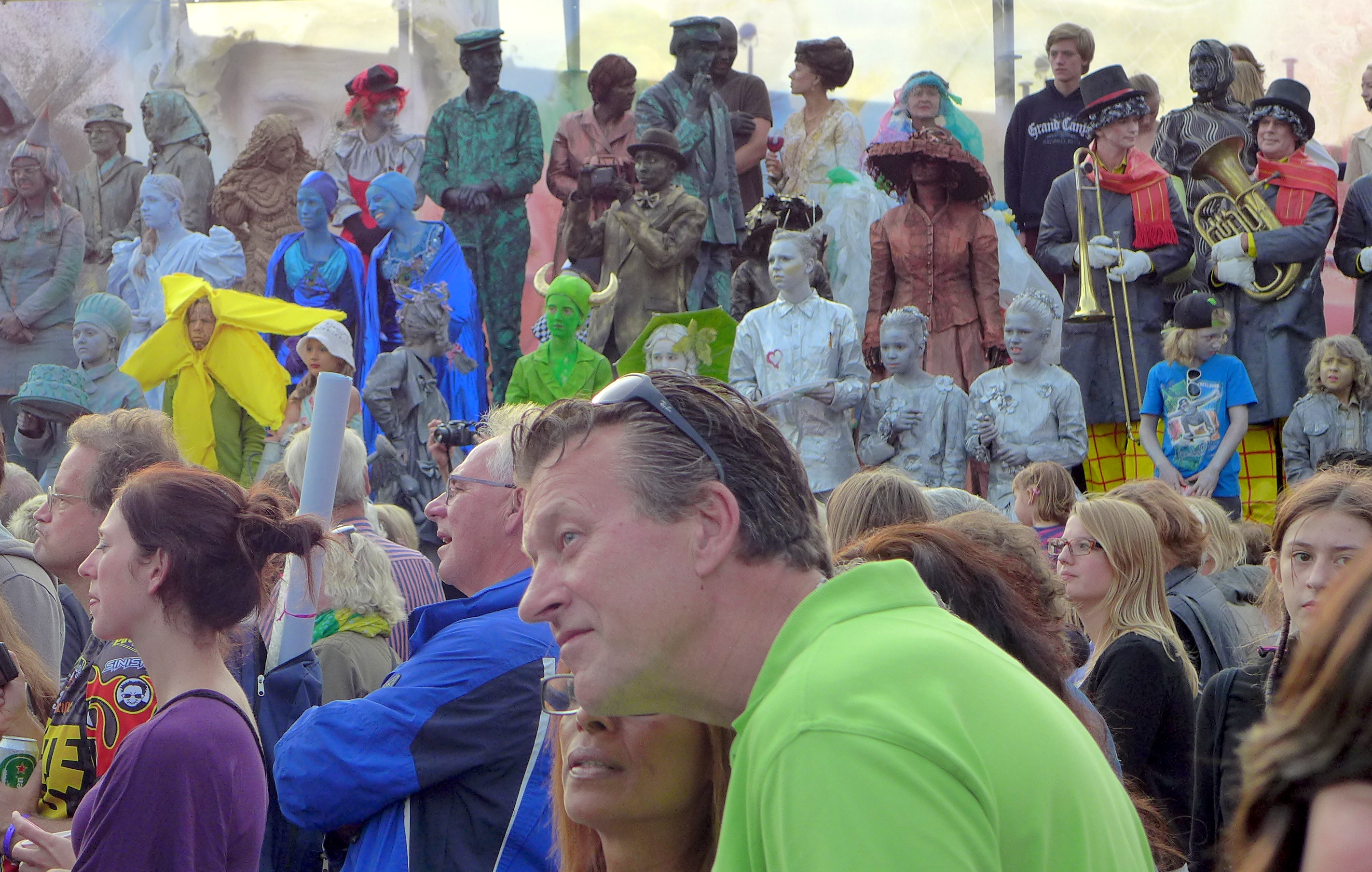 Next day was Arnhem – a really beautiful city with a lovely historic centre. 156 living statues in three categories: amateurs, professionals, kids. They literally ‘occupied’ the city. There was a one-way route and even in four hours, before the parade and judging ceremony at 6 o’clock, it was hard to see them all. I was taking notes furiously for future poems. It was fascinating how some of the living sculptures did little for me, or did not inspire, whereas with others, I immediately felt drawn because there was a story, something unsettling, a tension with the crowd. The best sculptures are often the simplest, the ones that don’t cover their eyes, but keep the crowd guessing, watching.